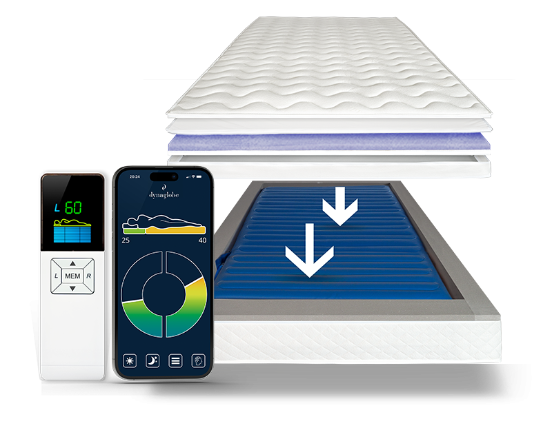 Auf unserem robusten und langlebigen Leichtgewicht und Publikumsliebling liegen Sie immer genau richtig! Denn der stabile Hi-Tech-Luftkern unserer luftgefederten Matratze passt sich Ihrer Körperform genau an und ist auf Knopfdruck jederzeit wunderbar veränderbar. Somit müssen Sie sich beim Matratzenkauf nicht mehr für einen bestimmten Härtegrad entscheiden und sind unabhängig von irgendwelchen Zonen und Härtegraden. Sofern der Luftdruck für Sie optimal eingestellt ist, wird Ihr Bewegungsapparat auf dieser Luftkernmatratze ergonomisch ideal gelagert. Gleichzeitig fördert unsere Matratze mit Luftkern auch ein angenehmes Schlafklima: Bei der Produktentwicklung hat Luftbetthersteller Markus Popfinger u.a. auch großen Wert auf Materialauswahl, Transport der im Schlaf abgegebenen Feuchtigkeit und eine gute Luftzirkulation gelegt. Dank modularem Aufbau sind alle Teile der luftgefederten Matratze – vom Bezug bis zum Luftkern – leicht und einfach zu reinigen. Das ermöglicht Ihnen einen hohen Hygienestandard. Und das vielleicht Beste für Sie bzw. Ihre Gäste: Zusammen mit der App (Softwareanwendung) Ortho-Well® als Sonderausstattung verwandelt die Dynaglobe®-Luftkernmatratze jedes Schlafzimmer, Hotelzimmer oder den Ruheraum einer Sauna in eine intelligente Wellness-Oase.